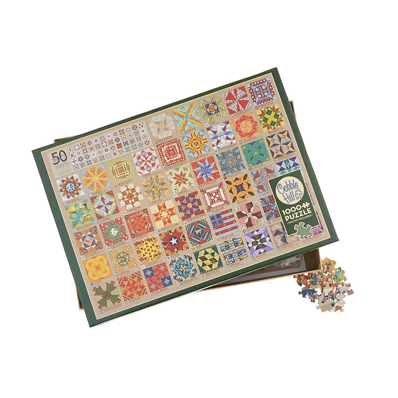 “50 State Quilt Blocks” takes inspiration from the 1907 – 1912 Hearth and Home Magazine when readers created their inspired quilt block of their home state. This 1000 piece puzzle celebrates the United States with beautiful quilt blocks reinterpreted by Cobble Hill Creations.