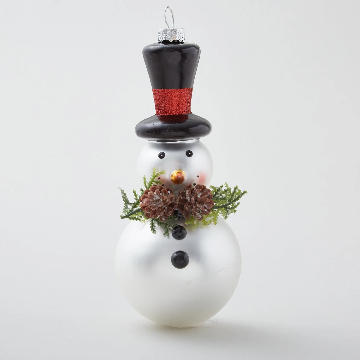 Decorate the tree with this cute blown-glass snowman ornament. The 6.5” tall snowman features a glittery red hatband, and manufactured pinecones and greenery sprinkled with snow-like glitter.