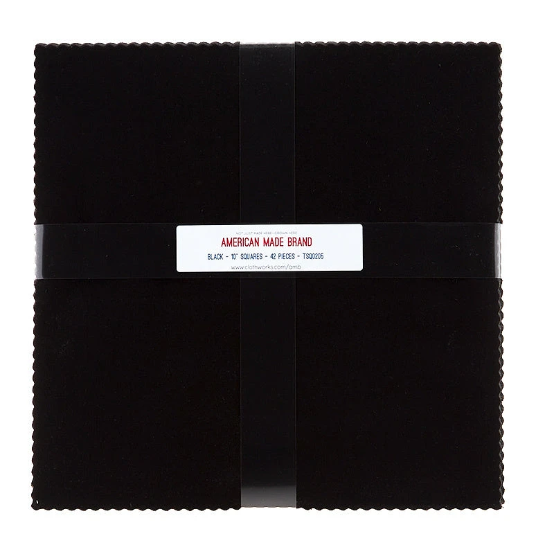 Layer cake of solid black 10″ squares. American Made Brand Cotton Solids by Clothworks are just that, American-made. Grown, woven, and dyed just for you right here in the USA, these quality cotton fabrics come in an impressive array of solid colors. Each shade is just as gorgeous as the other, so don’t be surprised if you find yourself wanting them all!