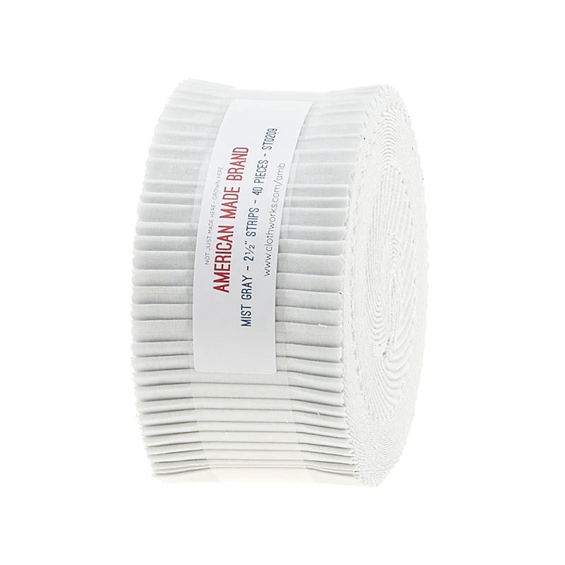Jelly roll of solid gray 2.5″ strips. American Made Brand Cotton Solids by Clothworks are just that, American-made. Grown, woven, and dyed just for you right here in the USA, these quality cotton fabrics come in an impressive array of solid colors. Each shade is just as gorgeous as the other, so don’t be surprised if you find yourself wanting them all!