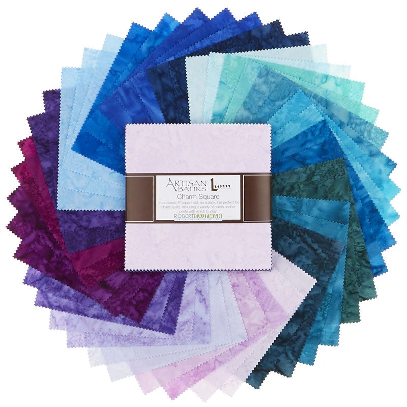 Charm pack of purple and blue batik solids. Perfect your batik project with coordinating batik solids in royal shades of purple and blue! Artisan Batiks Solids by Lunn Studios for Robert Kaufman delivers a lovely variety of batik solids. Explore these batik solids today and find which colors complement your project.