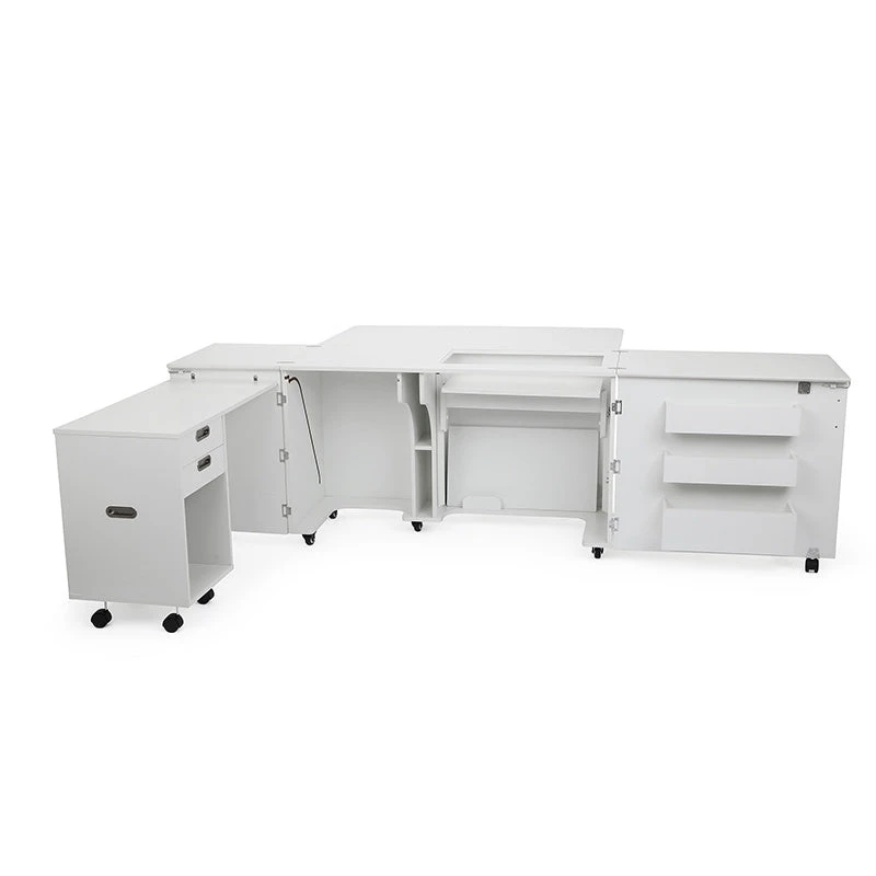 - Caddy can fit in any of three positions: Pull out near your sewing position, attached to door for larger work area, or freestanding