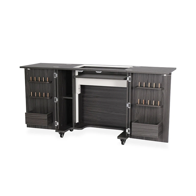 Don’t compromise when it comes to style vs. substance, this beautiful sewing cabinet has plenty of both! Modest at first glance with a quiet elegance, simply open the Bandicoot II Cabinet’s doors and watch it transform into a spacious sewing table with over five feet in length! It features a dual shelving unit, ten thread spool holders per door, and generous door cubbies for all your notions. Suddenly, you have plenty of workspace and storage at your fingertips!