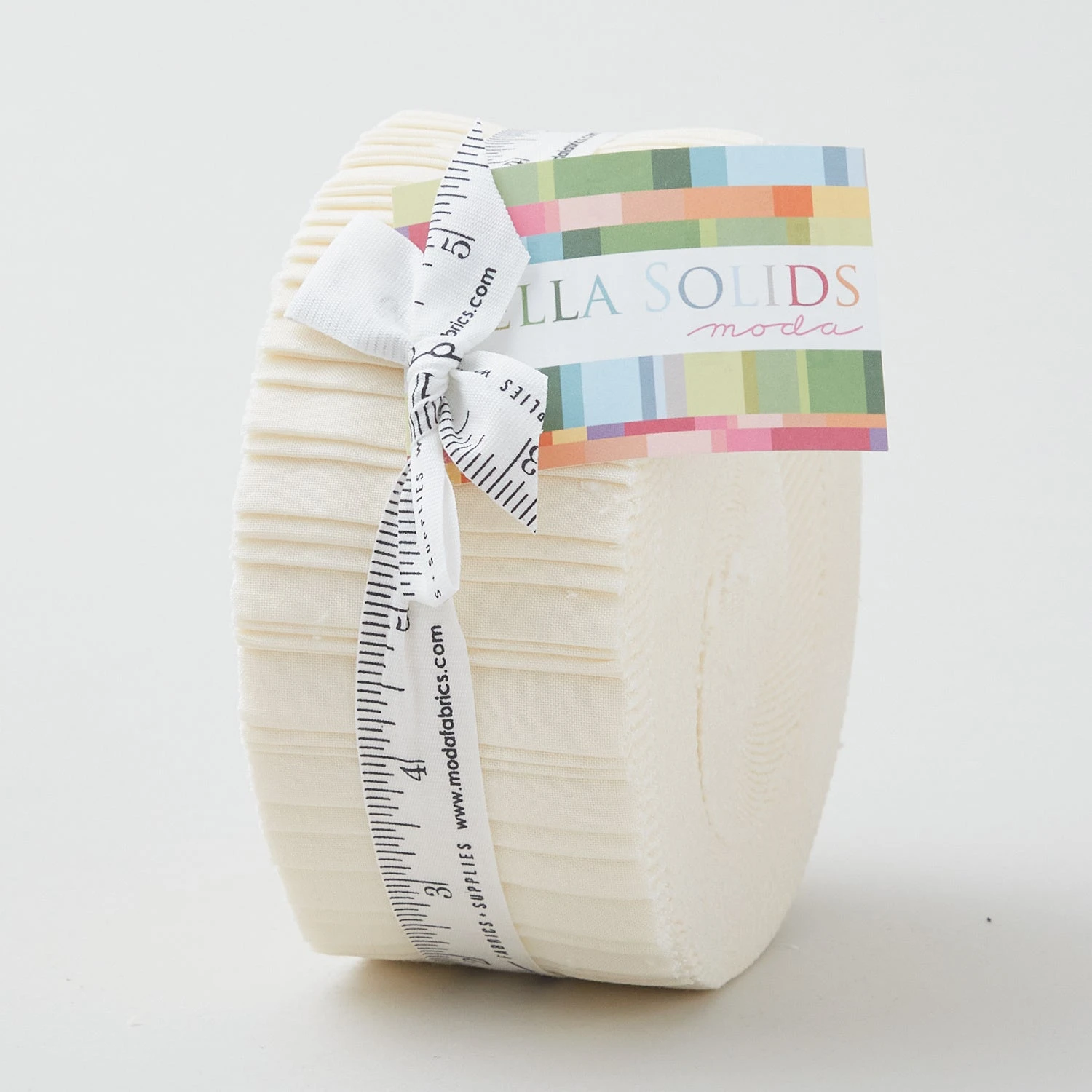 Jelly roll of Bella solid white 2-½” strips. Solids are fantastic because of the balance they bring to quilts! If you need to balance out your project, consider Bella solids from Moda Fabrics! When it comes to Bella, you’ll always find the color you need, whether it’s sangria pink or lemon yellow.