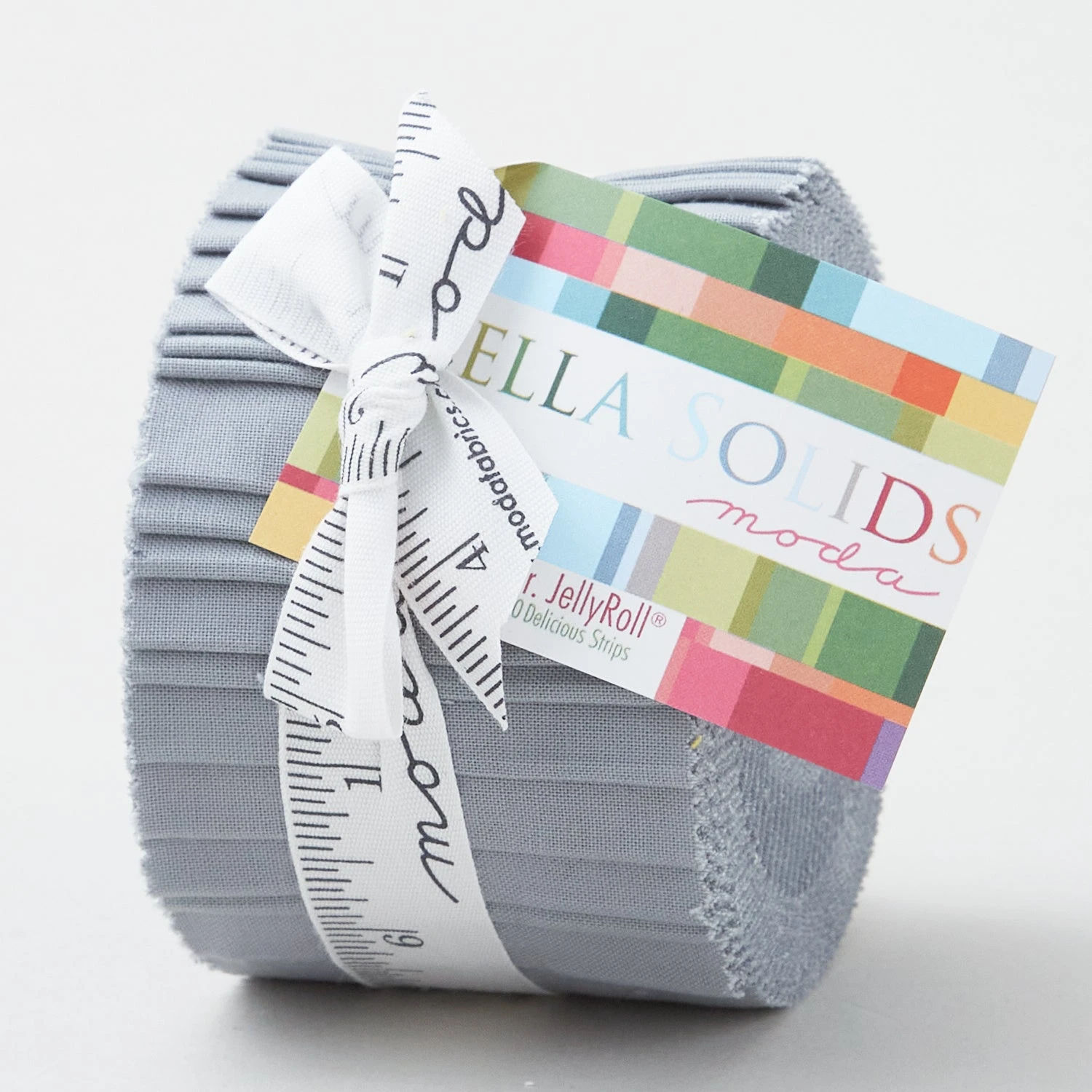 Junior jelly roll of Bella solid gray 2-½” strips. Solids are fantastic because of the balance they bring to quilts! If you need to balance out your project, consider Bella solids from Moda Fabrics! When it comes to Bella, you’ll always find the color you need, whether it’s sangria pink or lemon yellow.