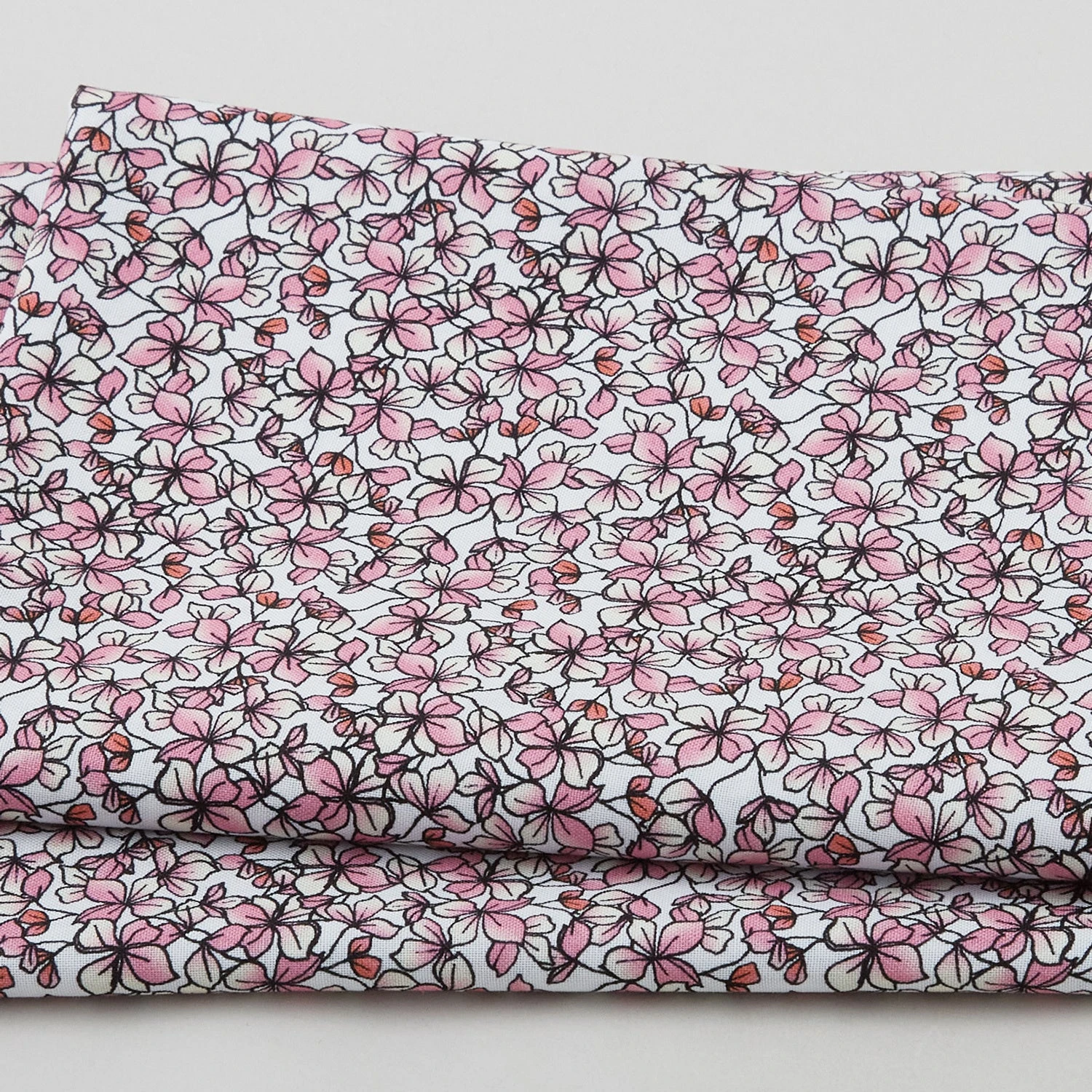 A 2-yard cut of pink and orange flowers, outlined in black, on a white background. Belle Chasse Favorites from Fabric Editions contains floral, abstract, and tonal prints in a blue, orange, and green color palette.