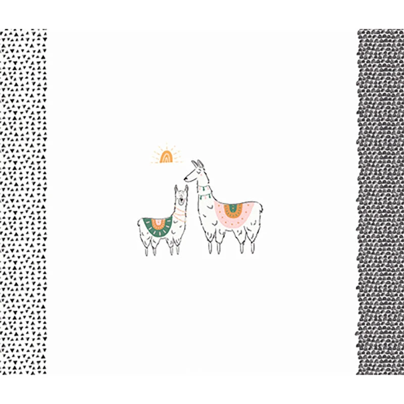 A white panel depicting a mother and baby llama wearing colorful southwestern blankets, and black geometric borders on either side. Past the miles of sand and mountains, deep in the southwest, we enter the whimsical world of Pacha. Where gentle creatures like llamas, porcupines, mice, and foxes etch their way through a black and white desert. Capsule Pacha by AGF Studio is a collection of Standard 100 OEKO-TEX certified fabrics.
