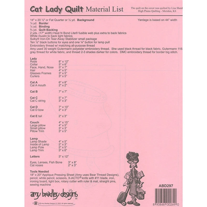 Cat Lady Quilt Pattern includes full size patterns, placement sheet, and instructions to make a 19 1/2″ x 25 1/2″ wall hanging. This pattern highlights a happy cat lady and her cats sitting on the couch. The technique is fusible appliqué.