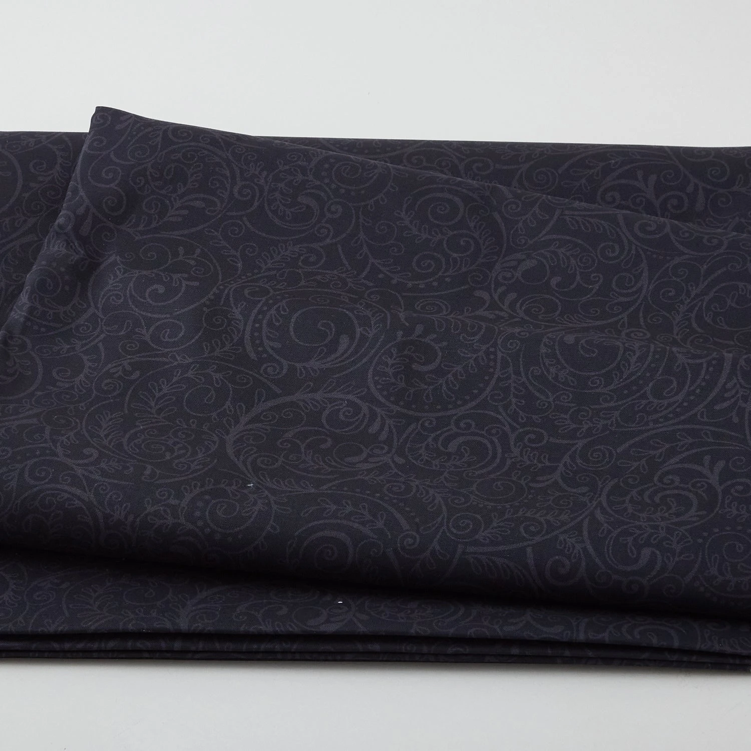 A 3-yard cut of wide backing material featuring gray swirling vines on a black background. Give it a swirl! Your quilt backs will look beautiful with elegant, swirling vines from Studio Eās Charleston collection! With shades ranging from cream to black, the color you need is here.