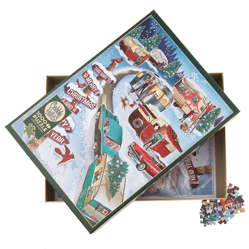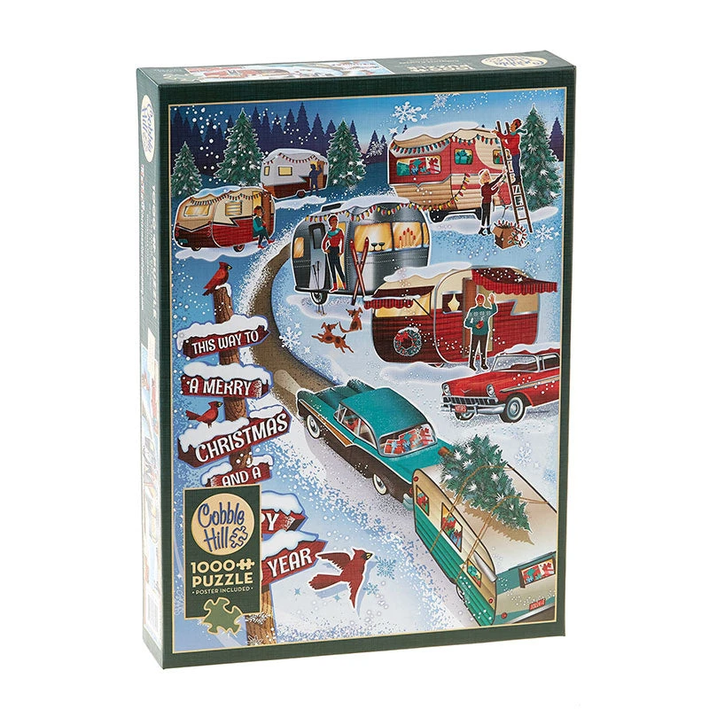 This way to a Merry Christmas and a Happy New Year! Piece together this picturesque puzzle of glampers gathering to celebrate the holidays! 1,000 piece jigsaw puzzle.
