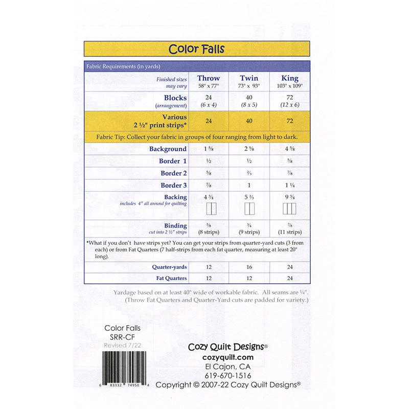The Color Falls Quilt Pattern from Cozy Quilt Designs turns 2 1/2″ strips into fascinating blocks that seem to move and sway off the quilt! This bargello effect is easy to achieve since it’s assembled in blocks. Showing off a range of light and dark fabrics, this quilt gets a fabulous finish with complementary background and borders. Full-color instructions available for three sizes!