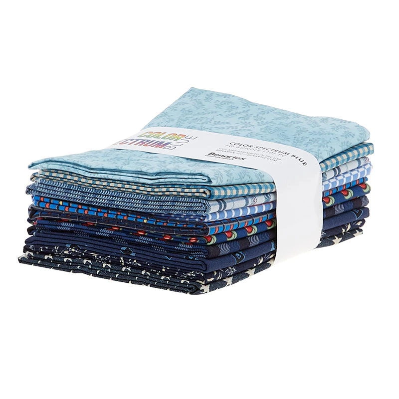 A fat quarter bundle of shades of blue with assorted patterns and designs. Sew with all the colors of the rainbow! The Color Spectrum fabric collection by Benartex Fabrics is a rainbow of patterns. This collection features colors bundled together with varied patterns. With fabrics this cute, you’ll never be blue!