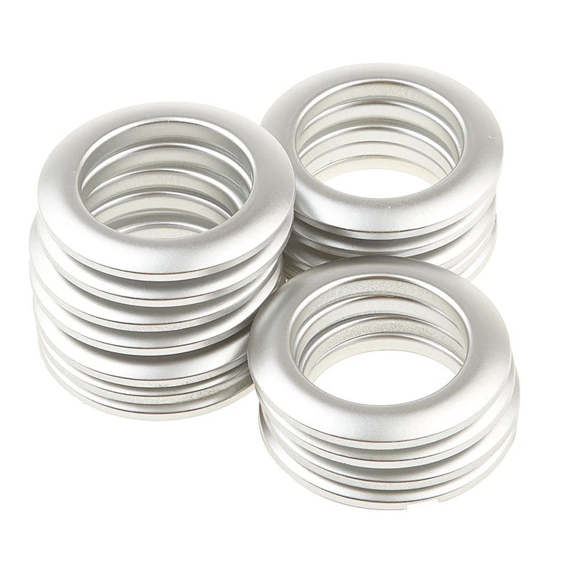 Eight brushed silver plastic grommets that just snap together, no tools needed. Perfect for holding up quilts or even making bags! The only limit to these small wonders is your imagination. Size 1 9/16″ interior diameter and 2 3/8″ exterior diameter.