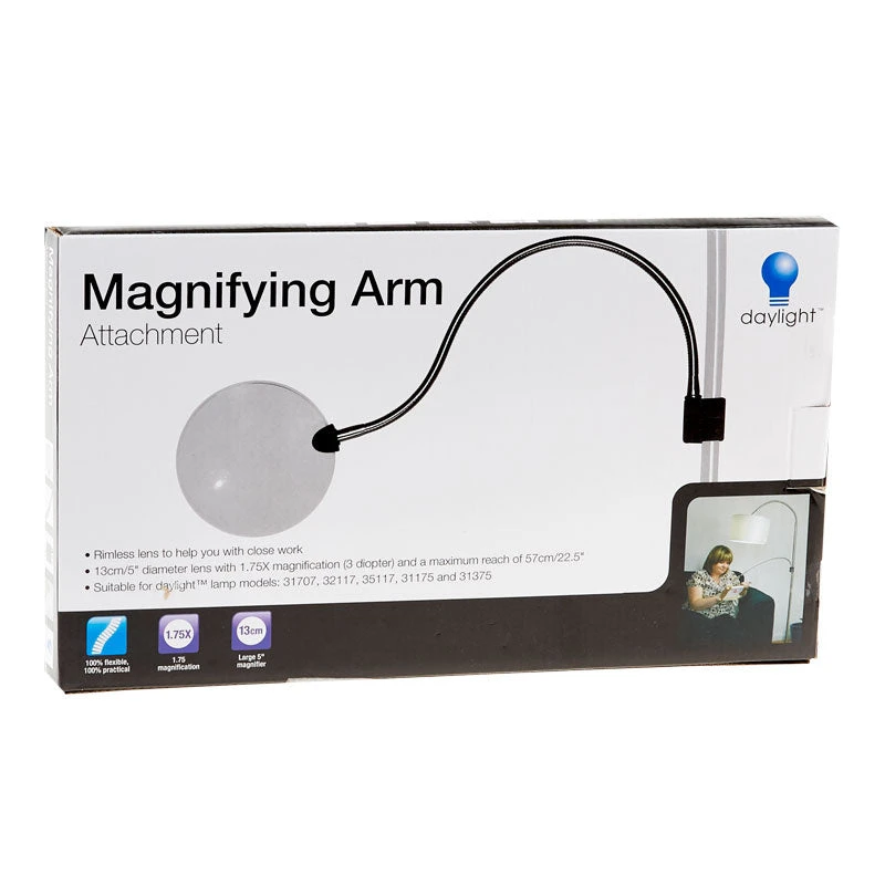 Magnifying arm for the Daylight Slimline range of lamps. Designed to clip onto the lamp stem. The rimless acrylic magnifier has 1.75X magnification.