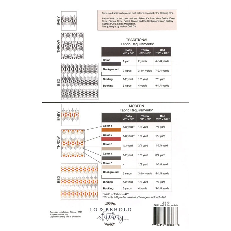 It’s the bee’s knees! Deco, a traditionally pieced quilt pattern, is inspired by the Roaring Twenties! The pattern, by Lo & Behold Stitchery, includes design options for both traditional and modern colorways. You get instructions for three quilt sizes: Baby 45″ x 50″, Throw 56″ x 68″ and Bed 102″ x 102″.