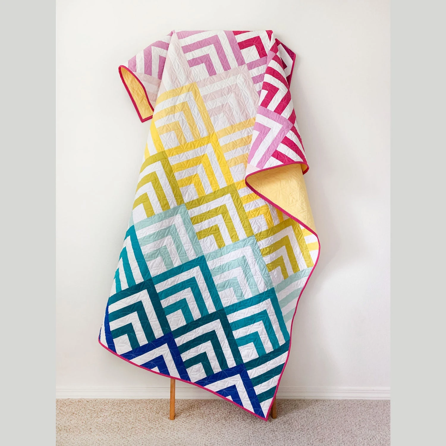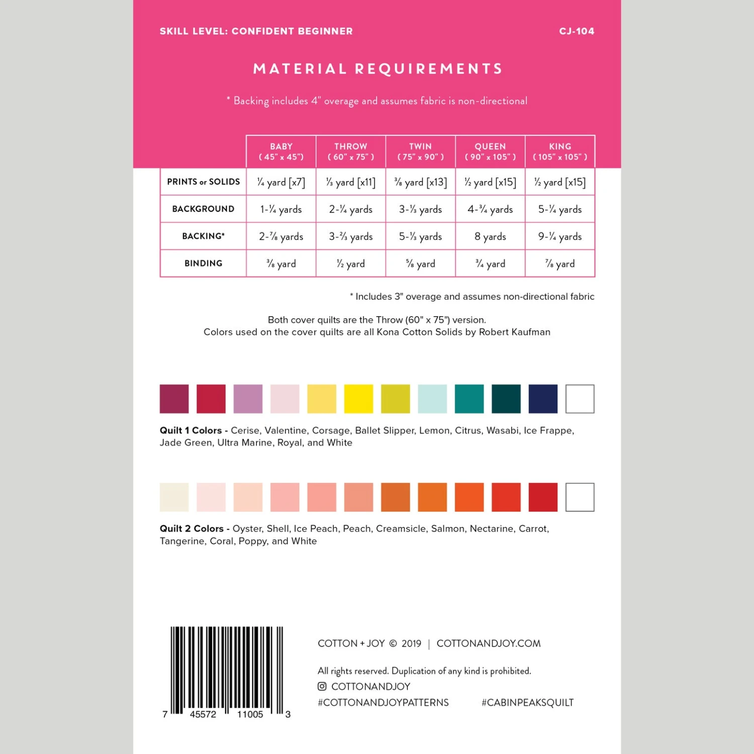 Cabin Peaks takes the classic Log Cabin quilt block and turns it on its side! This modern pattern from Cotton and Joy is perfect for confident beginners who are ready to practice precision piecing and on-point setting. Pattern includes helpful diagrams, detailed instructions, and a Color-Your-Own page to help you decide your fabric choices. The cover quilts were made using Kona Cotton Solids by Robert Kaufman.