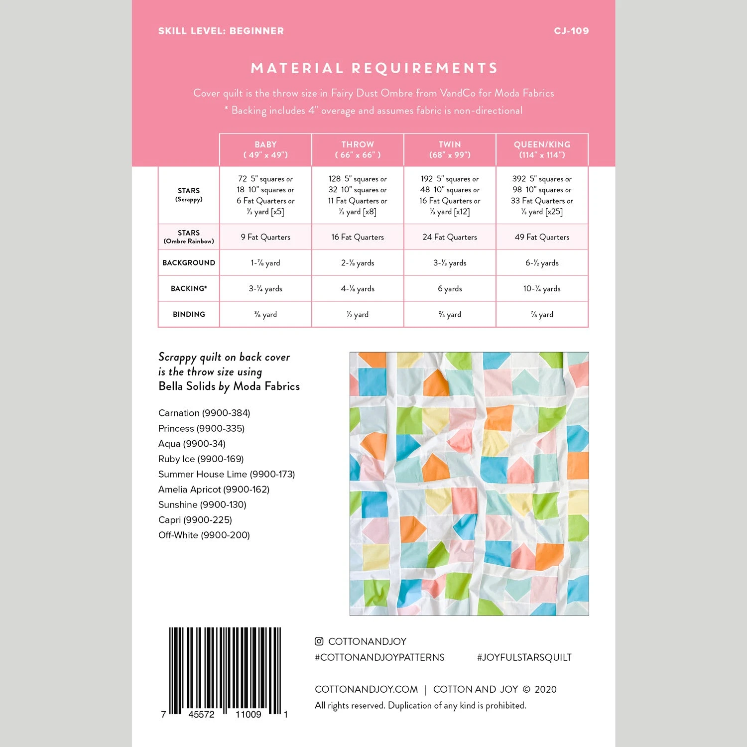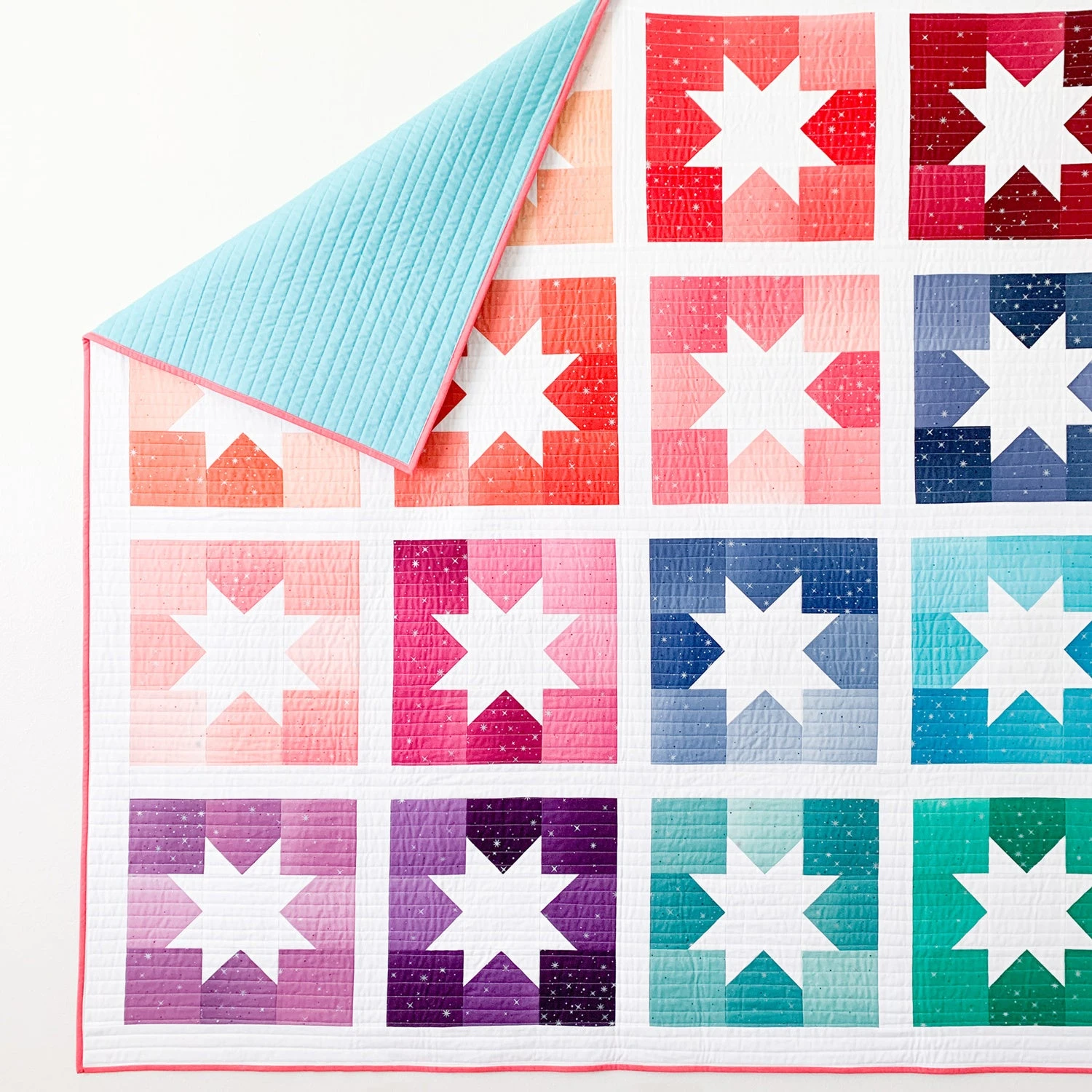 Jump for joy! Joyful Stars is a fun and modern star quilt pattern that works well with solids, prints, or scraps. It’s precut-friendly, too! Joyful Stars from Cotton and Joy is a great beginner pattern because it doesn’t have any tricky piecing. You can make an ombre rainbow version, as seen on the cover, or a scrappy version. Pattern includes detailed instructions for both versions, helpful diagrams, and a Color-Your-Own page to help you decide your fabric choices.