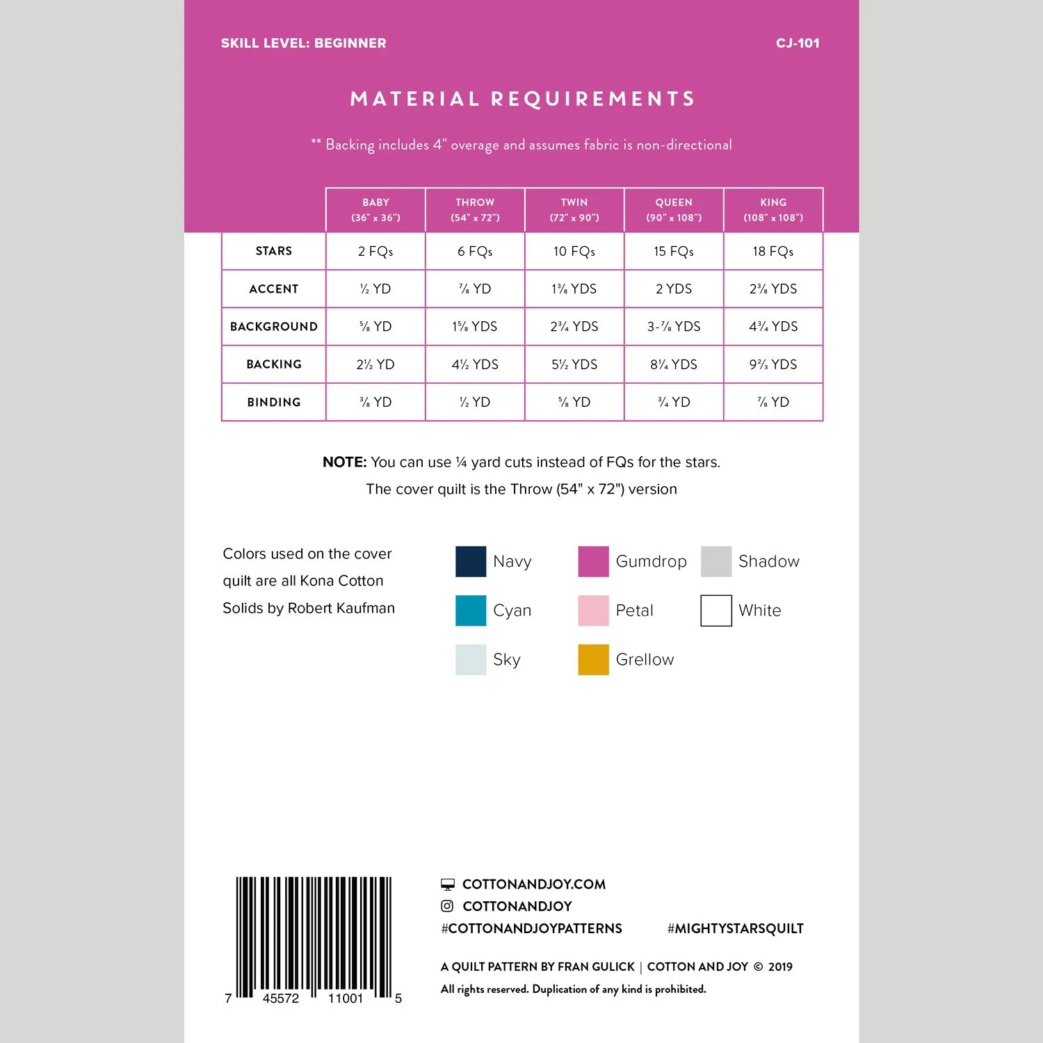 The Mighty Stars quilt pattern from Cotton and Joy is a fun and modern take on a classic block, the friendship star. It is a mix-and-match block-based quilt that has minimal waste. You can use the large center squares to highlight your favorite prints! Pattern includes helpful diagrams, detailed instructions, and alternate colorways to help you decide your fabric choices. The throw-size quilt pictured on the cover was made with Kona Cotton Solids by Robert Kaufman.