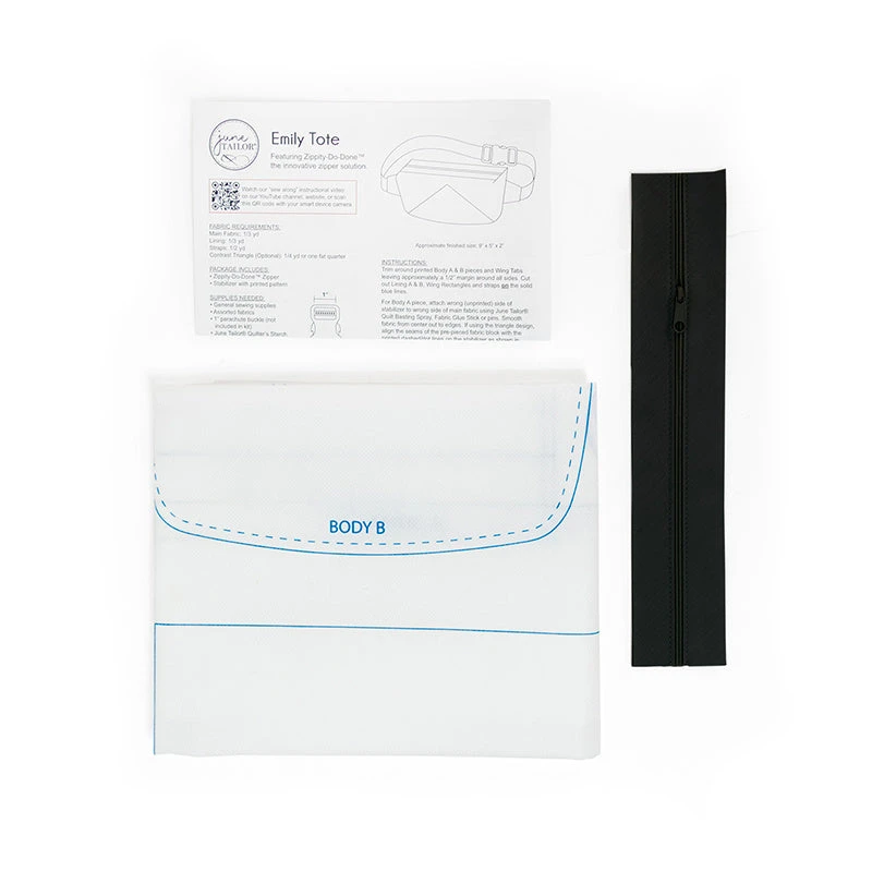 You’ll have this stylish tote completed faster than you can say, “Zippity-do-done”! The Emily Tote is similar to a fanny pack in terms of design, accessibility, and convenience, so if this sounds like a must-have accessory, let’s start sewing! Kit includes “sew on the line” printed stabilizer for one tote, one black Zippity-Do-Done pre-sewn zipper, video link and instructions. Fabric and tote hardware NOT included, you’ll need one 1″ Parachute Buckle.