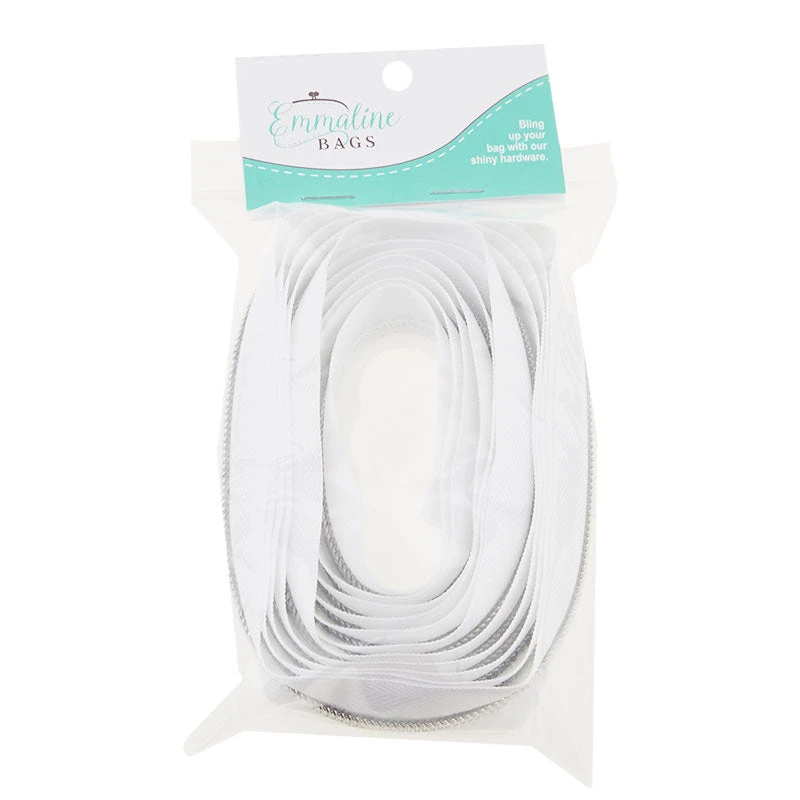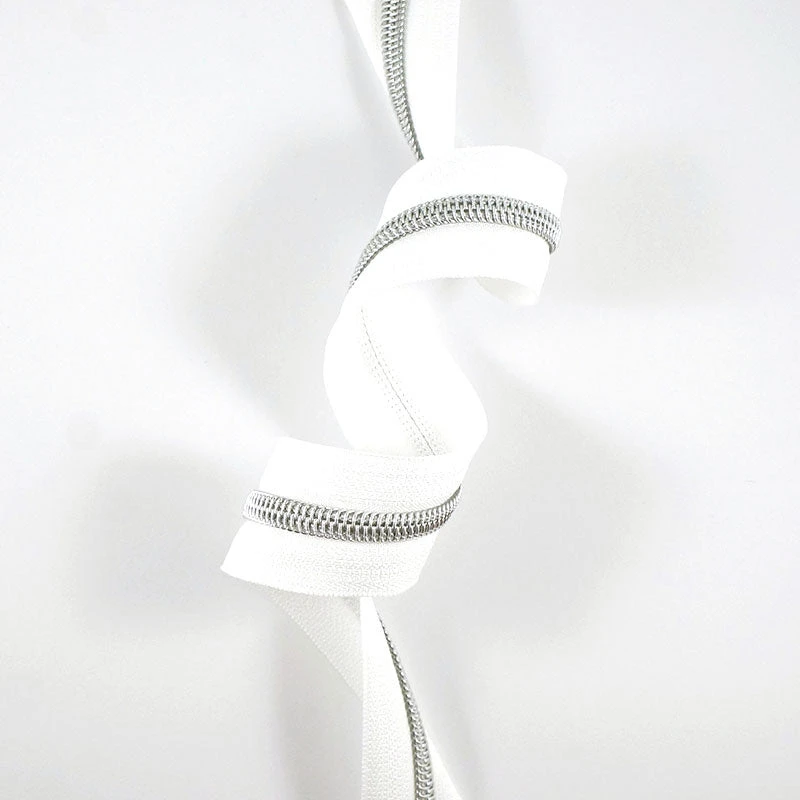 3-yard roll of a white nylon and silver zipper. The #5 nylon coil zippers from Emmaline Bags are perfect for areas where you want a heavier zipper, such as bag openings or side pockets. Tip: you can make double zippers by adding two zipper pulls in either direction! #5 Zipper sliders and pulls sold separately.
