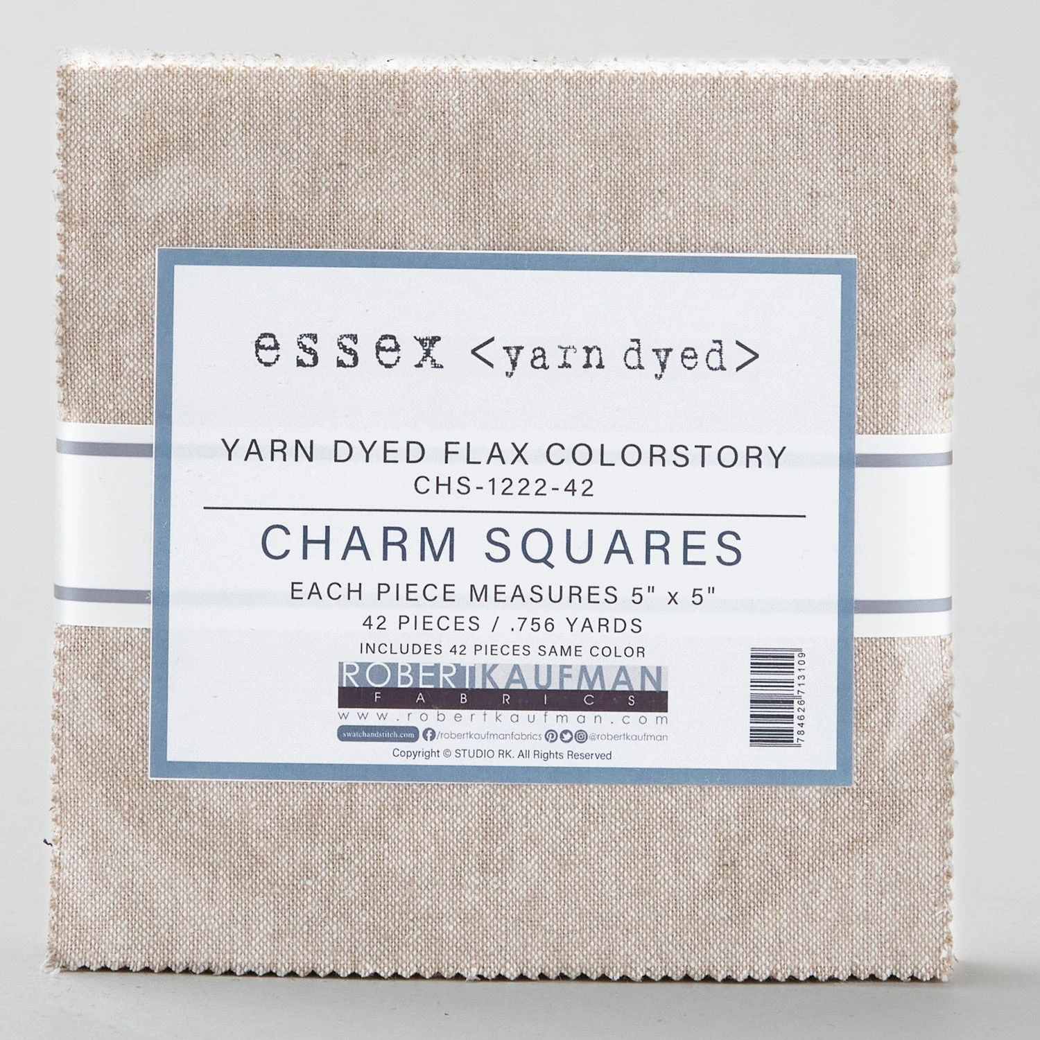 A pack of 5″, flax, yarn-dyed linen squares. Essex Solids from Robert Kaufman provide the staple colors you need along with quality you can trust. Browse through these solids to find just the right color for a particular project, or stock up on several to have on hand for when inspiration strikes!