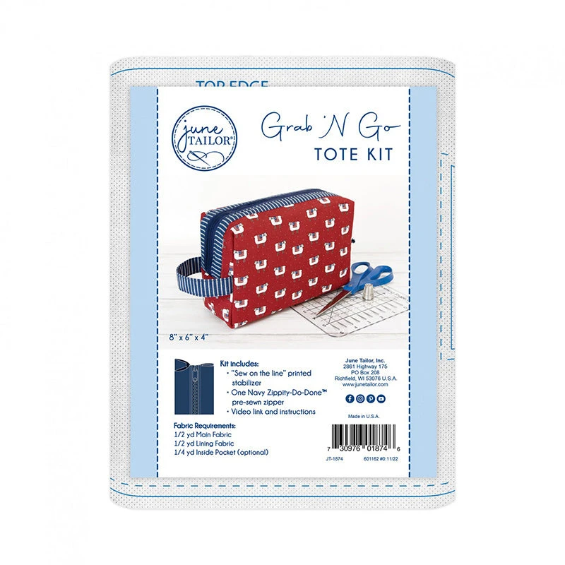 Sew a Grab ‘N Go Tote with this kit from June Tailor! This boxy zippered bag is designed to take your essentials with you anywhere and features a carrying handle and optional interior pocket. Kit includes printed utility fabric for one tote, instructions, and one Zippity-Do-Done™ pre-sewn zipper in navy. You get to supply your own fabrics for the perfect touch!
