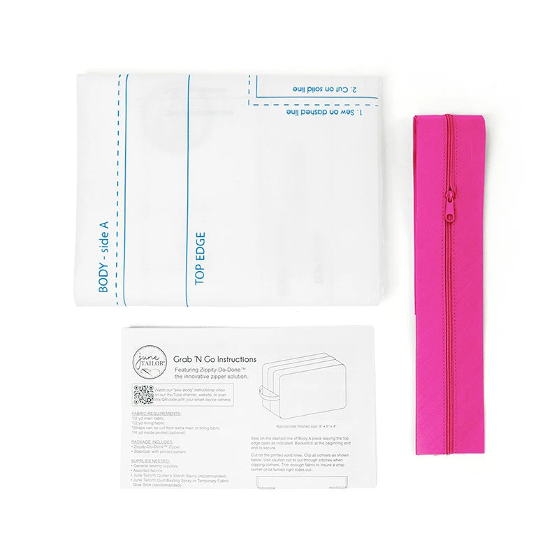 Sew a Grab ‘N Go Tote with this kit from June Tailor! This boxy zippered bag is designed to take your essentials with you anywhere and features a carrying handle and optional interior pocket. Kit includes printed utility fabric for one tote, instructions, and one Zippity-Do-Done™ pre-sewn zipper in bright pink. You get to supply your own fabrics for the perfect touch!
