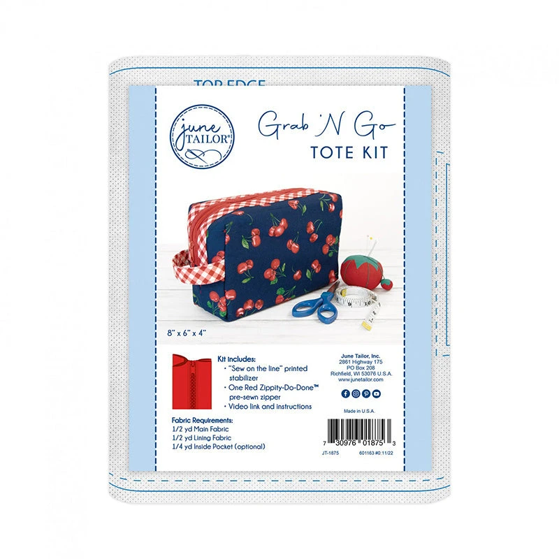 Sew a Grab ‘N Go Tote with this kit from June Tailor! This boxy zippered bag is designed to take your essentials with you anywhere and features a carrying handle and optional interior pocket. Kit includes printed utility fabric for one tote, instructions, and one Zippity-Do-Done™ pre-sewn zipper in red. You get to supply your own fabrics for the perfect touch!