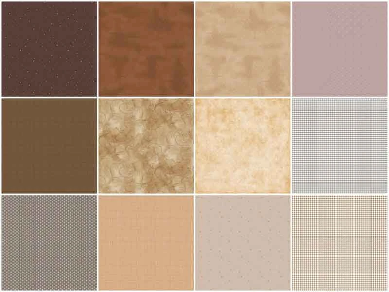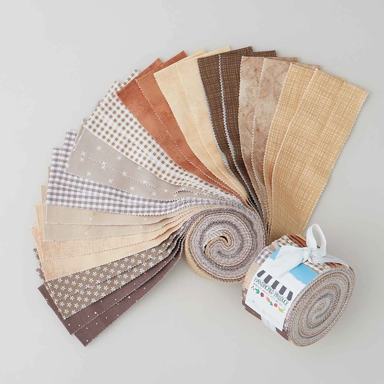 Jelly roll of 2 1/2” strips with textured solids, dots, checks, and other small prints in shades of brown and cream. Browsing through the Handpicked Produce collection from Riley Blake is like strolling through a farmers market! You’ll see fresh greens and juicy oranges in patterns that are pretty as a peach! From sweet solids to beautiful blossoms, you’ll find just the right ingredients for your quilted project.