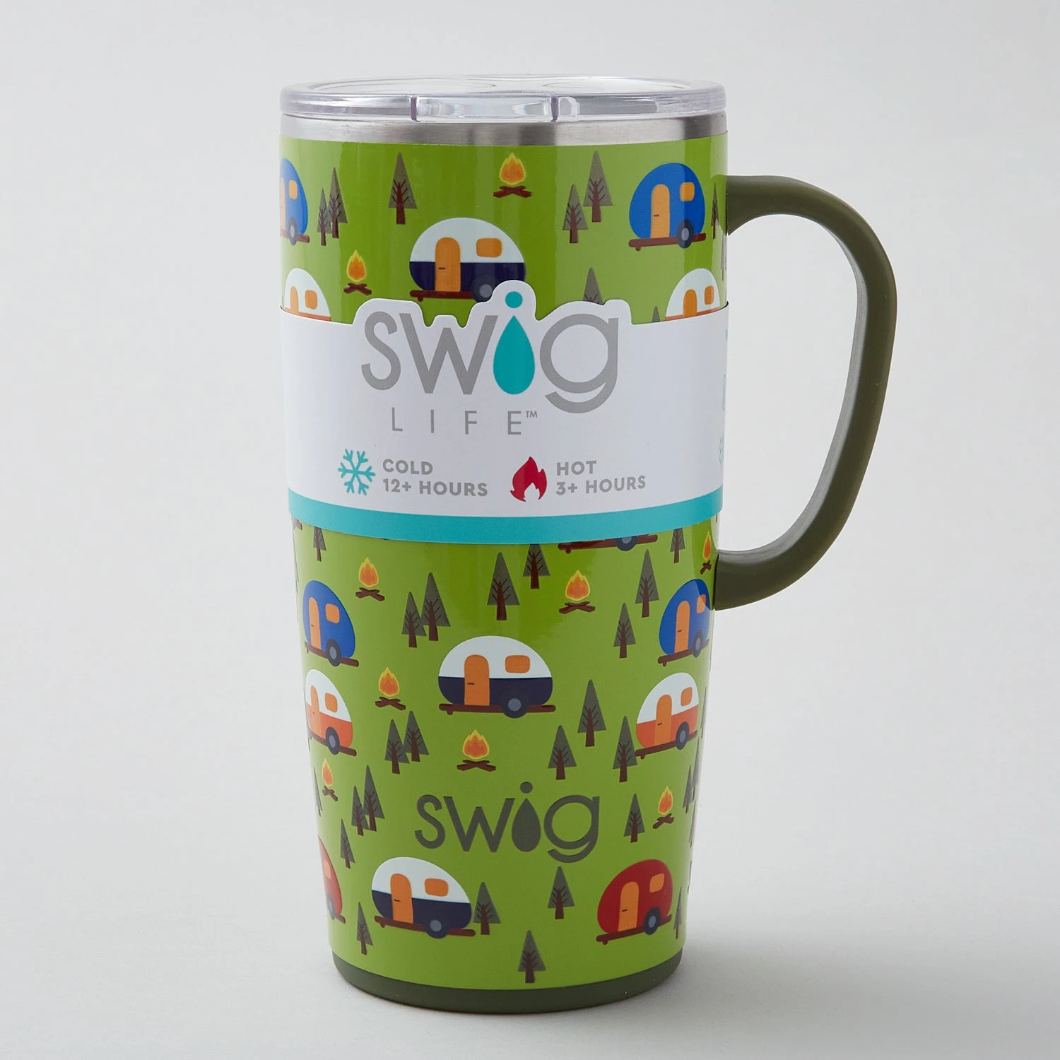 Keep your coffee hot and your water cold with the stylish Happy Camper Travel Mug! Designed by Swig Life, this 22oz mug is made with triple insulation technology, meaning it will keep drinks cold for 12+ hours and hot for 3+ hours. Fits most standard cup holders, features slip-free and noise-free silicone base, and slide closure lid.