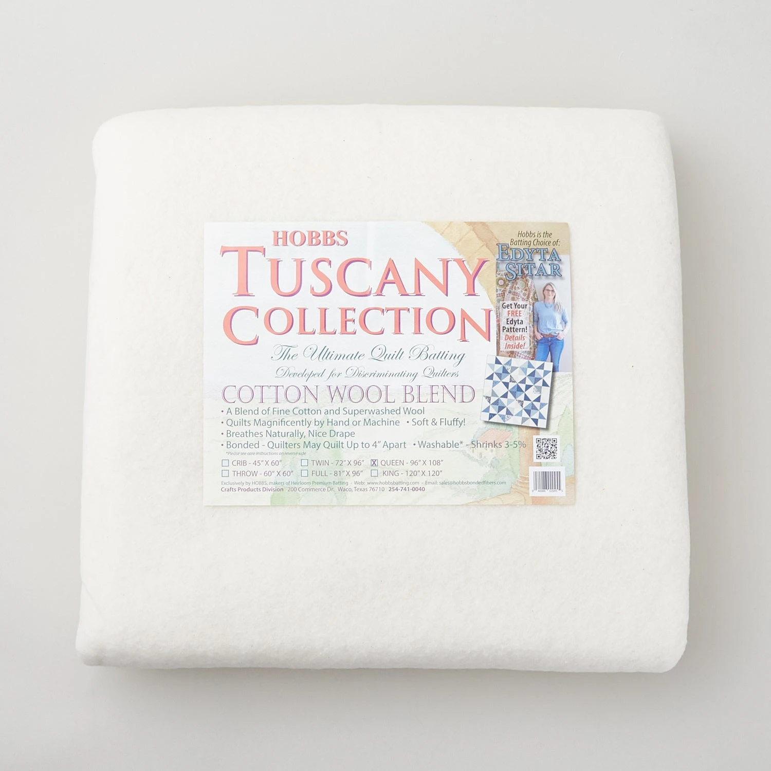 Take a trip to Tuscany with this exciting blend of 80% fine cotton and 20% superwashed wool! Hobbs Tuscany Cotton Wool Blend is designed for hand quilting, machine quilting, and long-arm projects. Designed to resist bunching and fiber migration, this lofty batting shows off detailed stitch patterns, has a lovely drape, and is both soft and stable. Best with medium or dark fabrics. Quilts get softer with many washes over time! Gentle machine washing and flat drying are suggested. May be quilted up to 4” apart and will only lightly shrink.