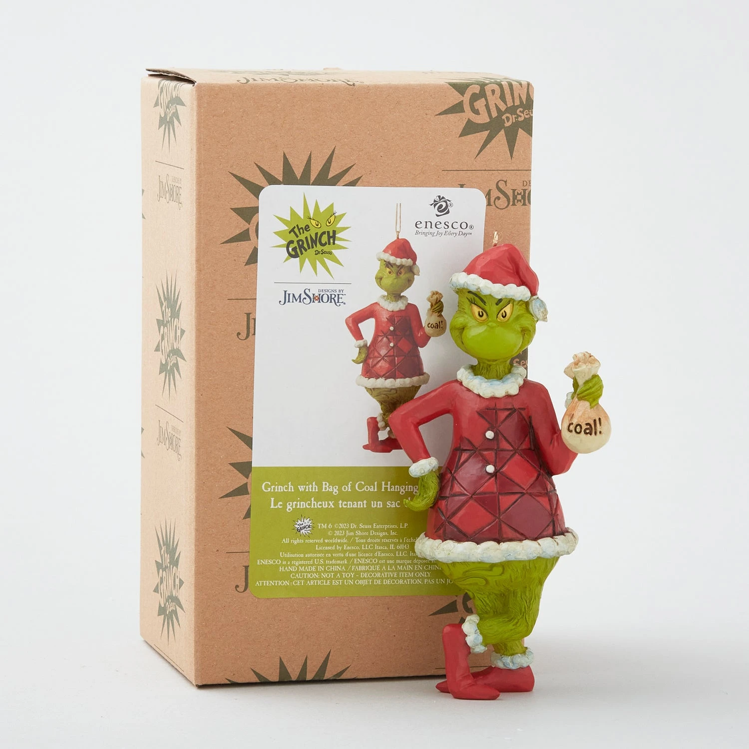 Dressed in his quilted, patchwork coat, the Grinch is ready to decorate your holiday tree. The hand-painted, stone resin hanging ornament from Jim Shore Designs features the green grinchy character smiling mischievously and clutching a bag of coal.