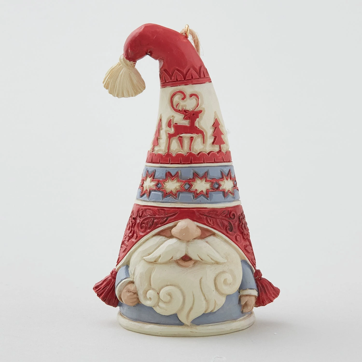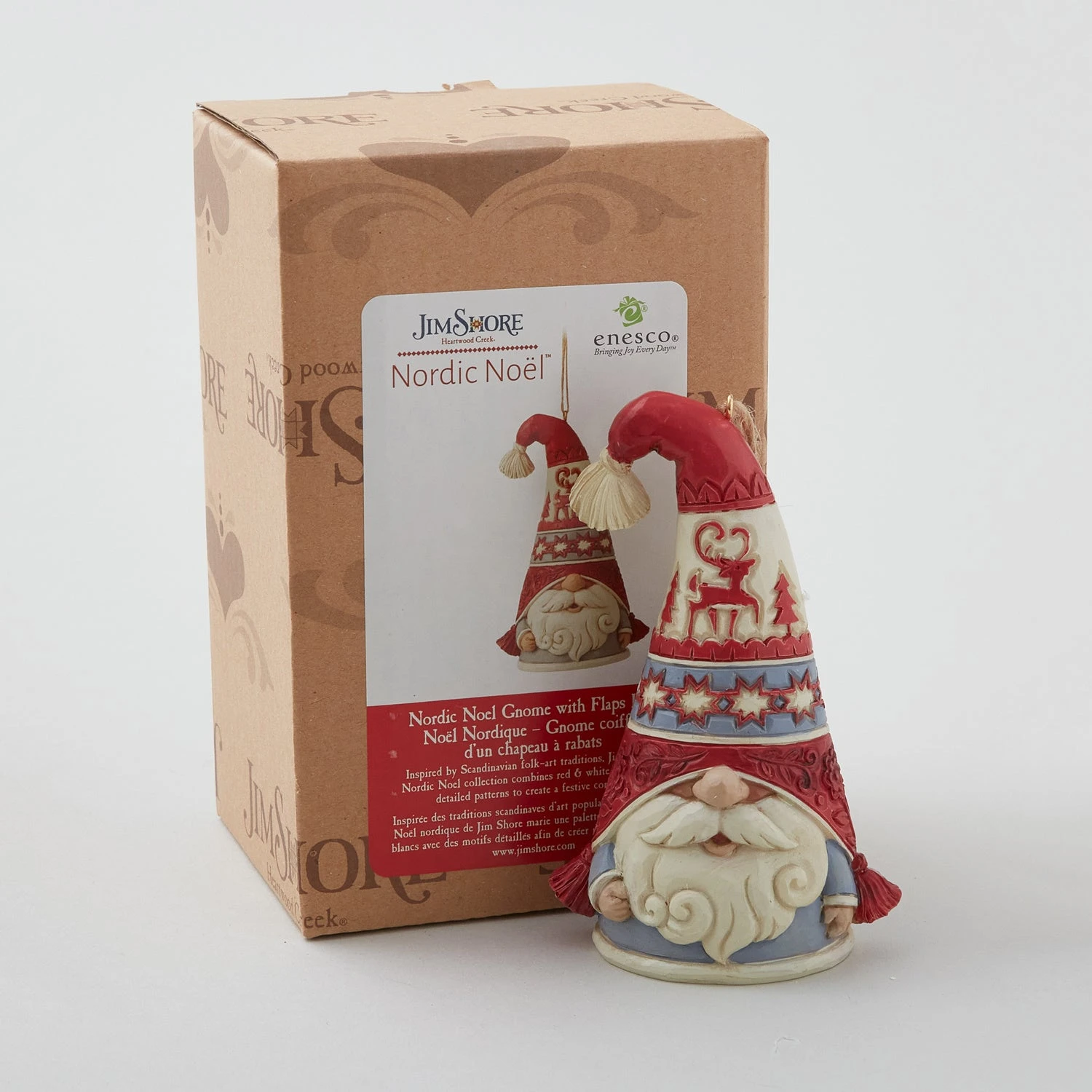 This whimsical Nordic gnome is staying warm and toasty in his earflap hat! The hand-painted, stone resin ornament could be displayed all winter long. Jim Shore’s Nordic Noel collection is inspired by Scandinavian folk art and combines red and white colors with detailed patterns to create a festive contrast.