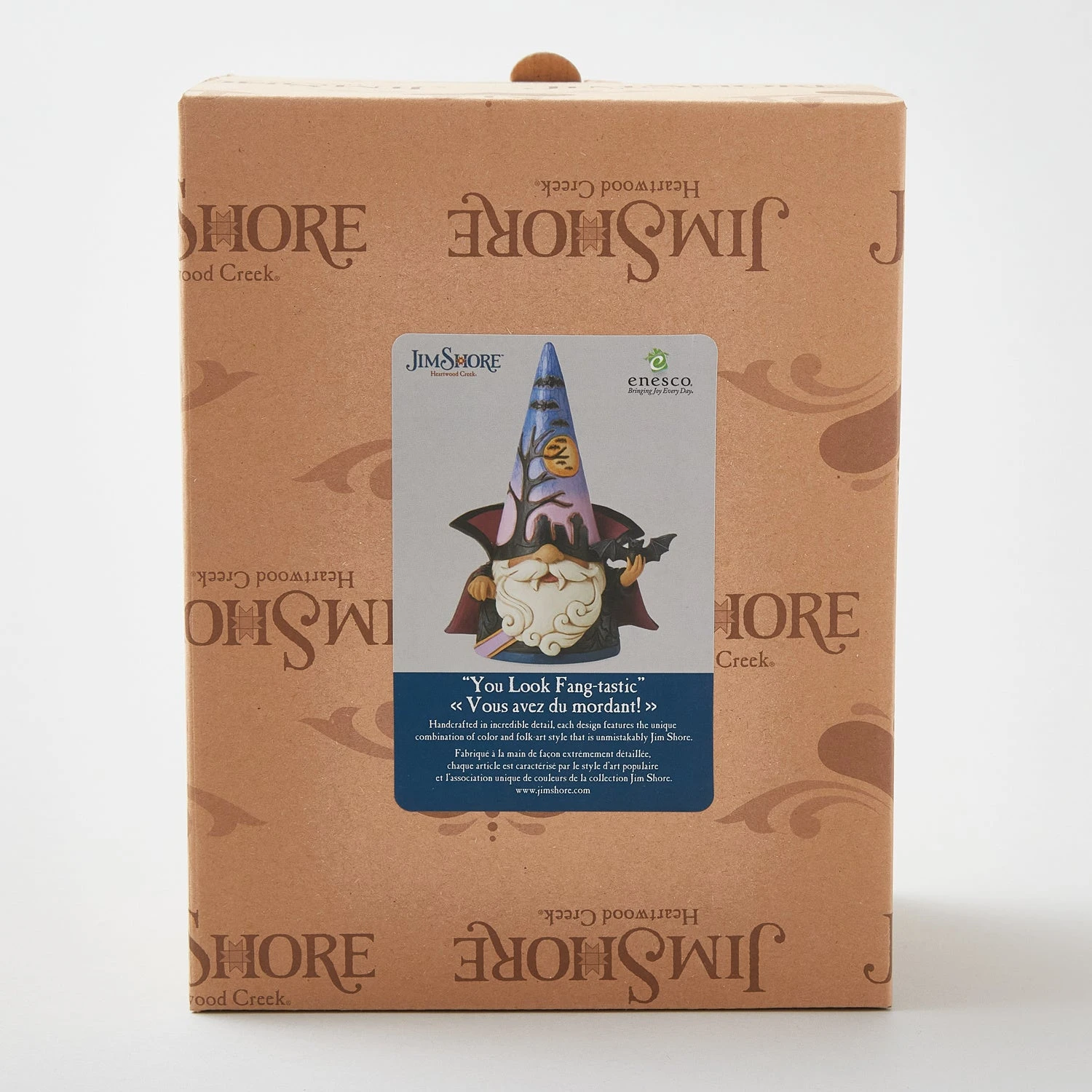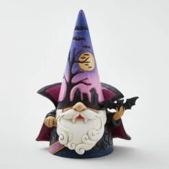 Welcome Halloween with this Jim Shore Heartwood Creek vampire gnome. The 7” high, hand-painted, stone resin figurine is holding a bat and wearing a hat decorated with a graveyard scene. He even has fangs below his bushy mustache!