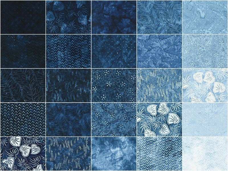 Blue 2.5″ batik strips of florals and foliage. “Kasuri” is actually a Japanese term for fabrics woven with fibers dyed to create patterns and images within the fabric, which is exactly what you’ll see in this collection! Kasuri by Lunn Studios for Robert Kaufman Fabrics is a gorgeous assortment of batiks in various shades of blue, featuring all sorts of mesmerizing prints.