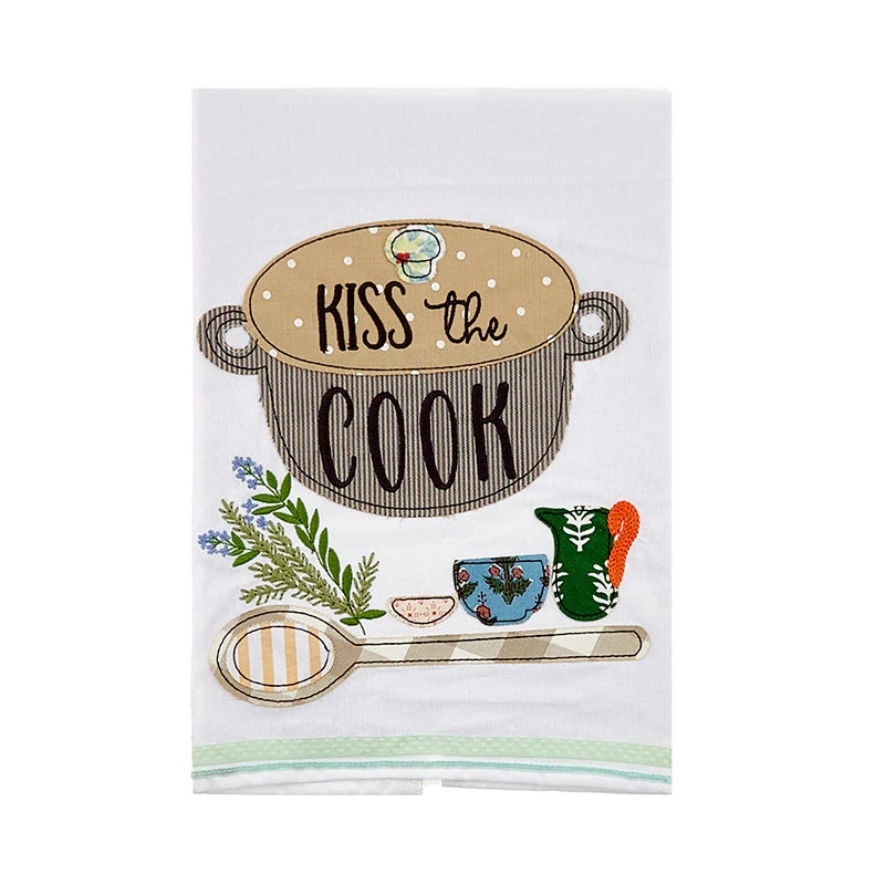 Add a fun touch to your kitchen with this tea towel featuring stitched kitchen tools, a cooking pot, and the saying, “Kiss the Cook.” Tea towels from Glory Haus are handmade in a fair-trade factory by women who have been caught in the cycle of economic and social oppression. The products help further Glory Haus’s mission of reducing poverty and injustice.