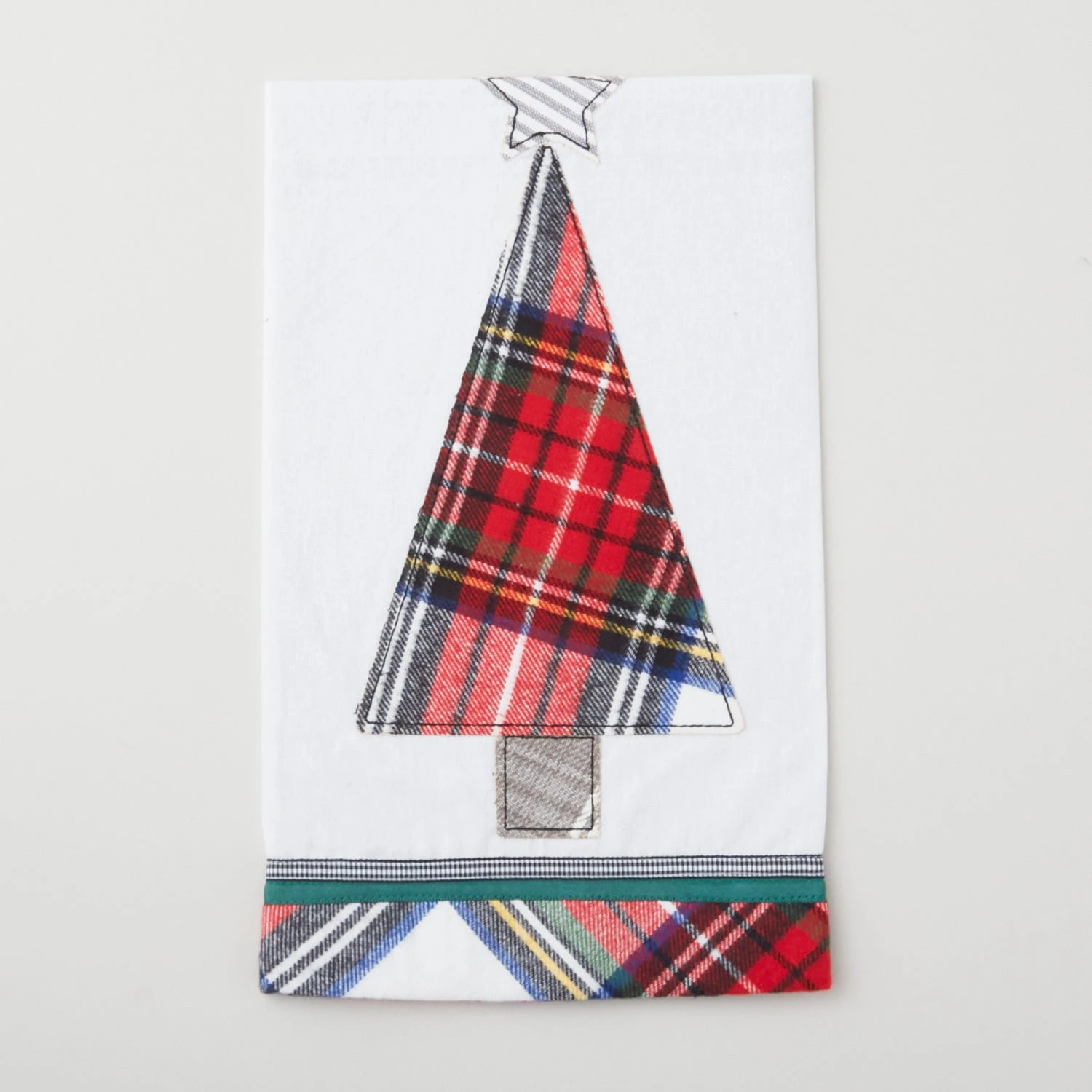 Add a festive touch to your kitchen with this tea towel featuring a flannel Christmas tree on a white background with a flannel border. This appliqued towel is a perfect addition for any holiday decorating.