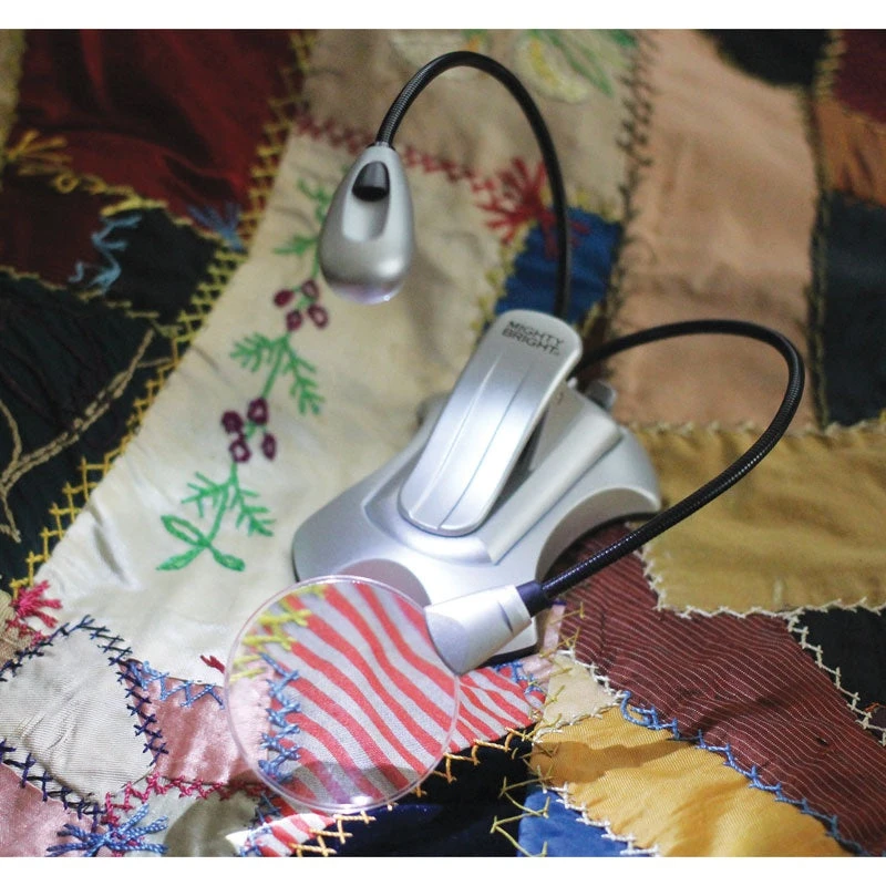 Two for one! Light and magnification. Two energy-efficient LED light with two brightness settings. 2″ lighted magnifier with 2X magnification. Base features rubber stoppers, large magnet and detachable clip, perfect for hoops and frames. Two flexible necks. Includes three AAA batteries.