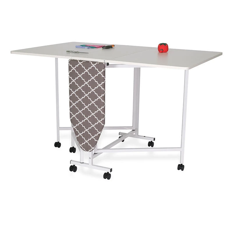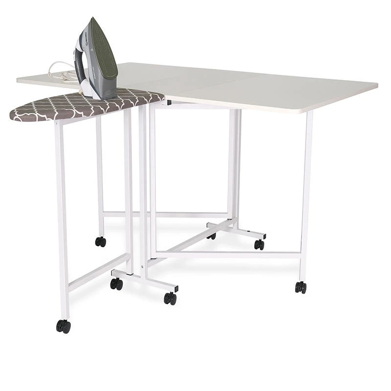 Who says you need a lot of space to have your dream quilting setup? Say hello to Millie, your new 2-in-1 cutting and ironing workstation! You’ll love this one-stop shop for cutting and pressing fabrics. Designed with your convenience in mind, Millie features a generous 63″ x 39″ cutting area and a built-in folding ironing station so you can swiftly pivot from one station to the next. This space-saving solution rolls on heavy-duty casters for easy mobility in your sewing area. Best of all, your Millie folds up into a tidy box when not in use so you can store it anywhere you’d like!