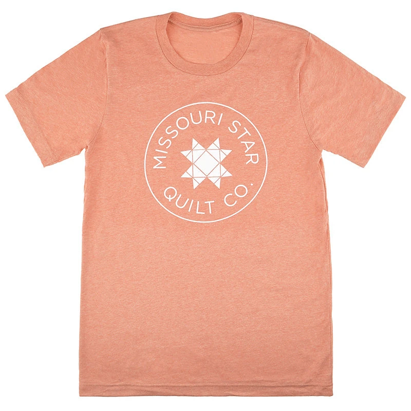 Show the world your favorite hobby and your favorite quilt company when you sport a Missouri Star Circle Logo T-shirt! This comfy unisex jersey tee features the Missouri Star Quilt Co. name and logo in white printing on a heather sunset tee. You’ll love it to pieces!