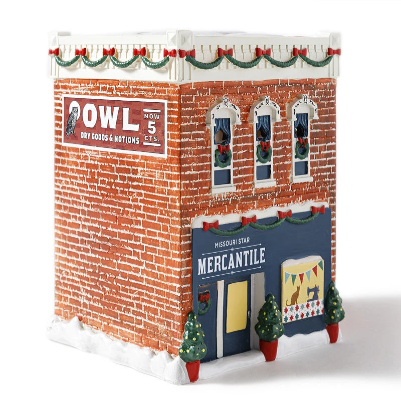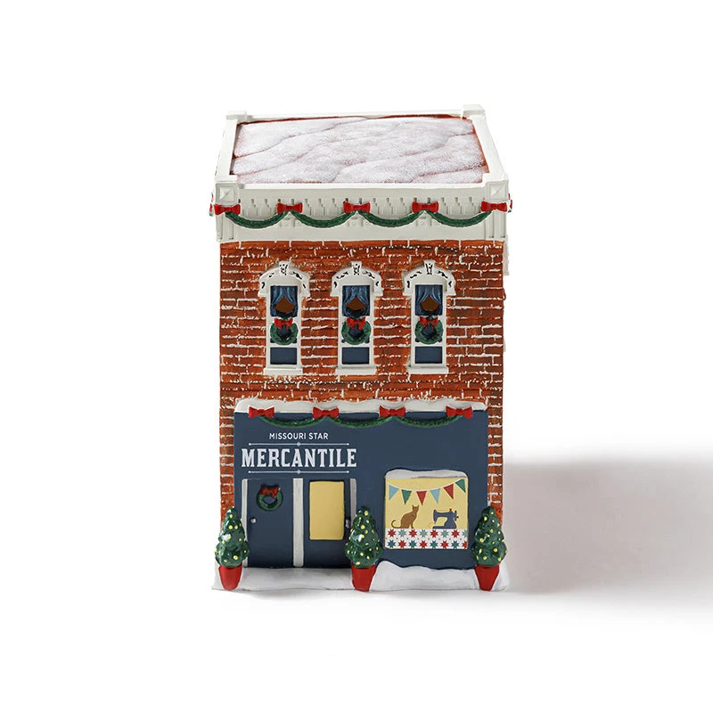 Can’t make it to Hamilton for the holidays? Bring Missouri Star home to you! This darling resin model is an accurate scale replica of our Mercantile Shop, festooned with snow, ribbon-adorned wreaths, and festive greenery just in time for Christmas. It features bright, colorful details throughout including a cat and sewing machine shown in the shop windows and three festive potted trees. Take a closer look and there are plenty of surprises to discover! Mini LED lights can be added to this model to light up the windows and create a warm glow emanating from within. Build your Missouri Star Winter Village collection with this stunning Mercantile shop replica!
