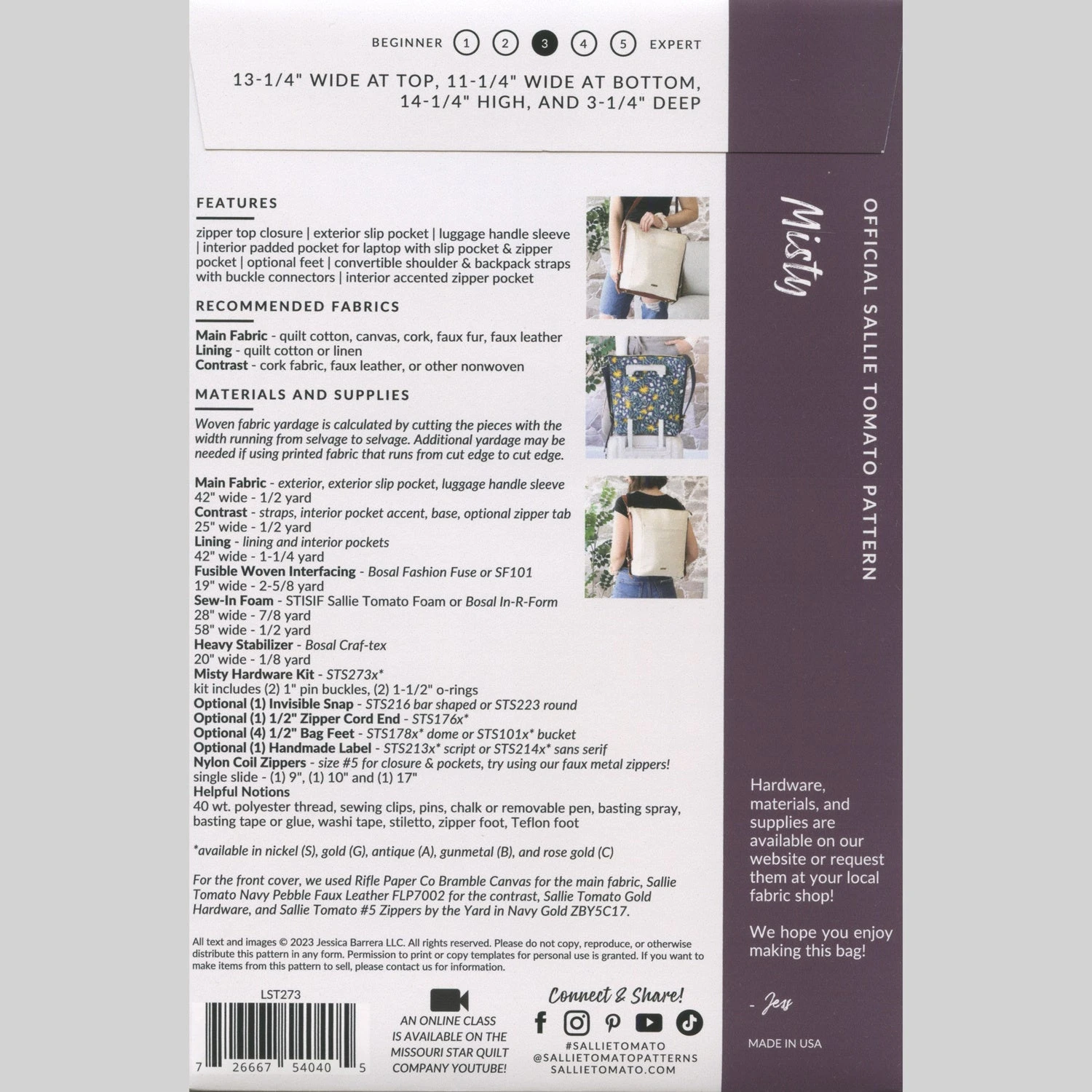 Say “hello” to Misty, your new favorite convertible bag! This fashionable and functional backpack is complete with an exterior slip pocket, carry-on sleeve, interior pockets including a laptop or tablet compartment, and comfortable straps to convert your backpack to a shoulder bag in an instant. Designed with the talented creator and sewing educator, Misty Doan of Missouri Star Quilt Company, this hands-free bag will soon become your favorite travel companion and everyday tote! Kit includes pattern, exterior and interior fabrics, bone faux waved canvas, fusible interfacing, sew-in foam, beige/gold zipper and all the hardware needed in gold finish.