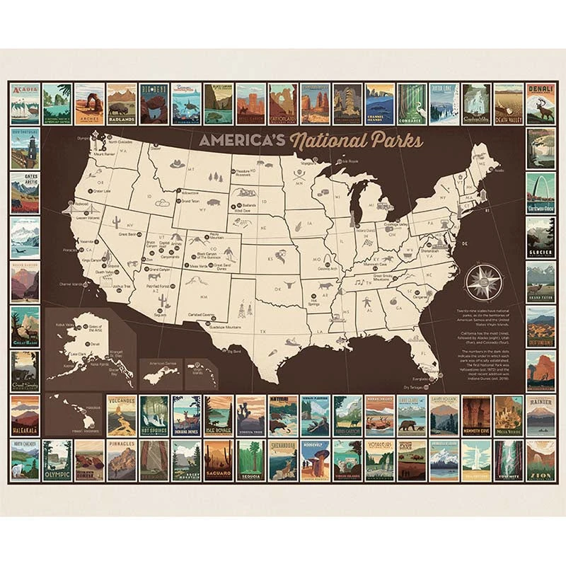 Panel depicting a map of the United States surrournded by Art Deco travel posters for national parks. The National Parks are some of the most beautiful places on Earth! Plan your nationwide roadtrip with this fabric collection full of Art Deco posters for Yosemite, Yellowstone, Zion, and more.