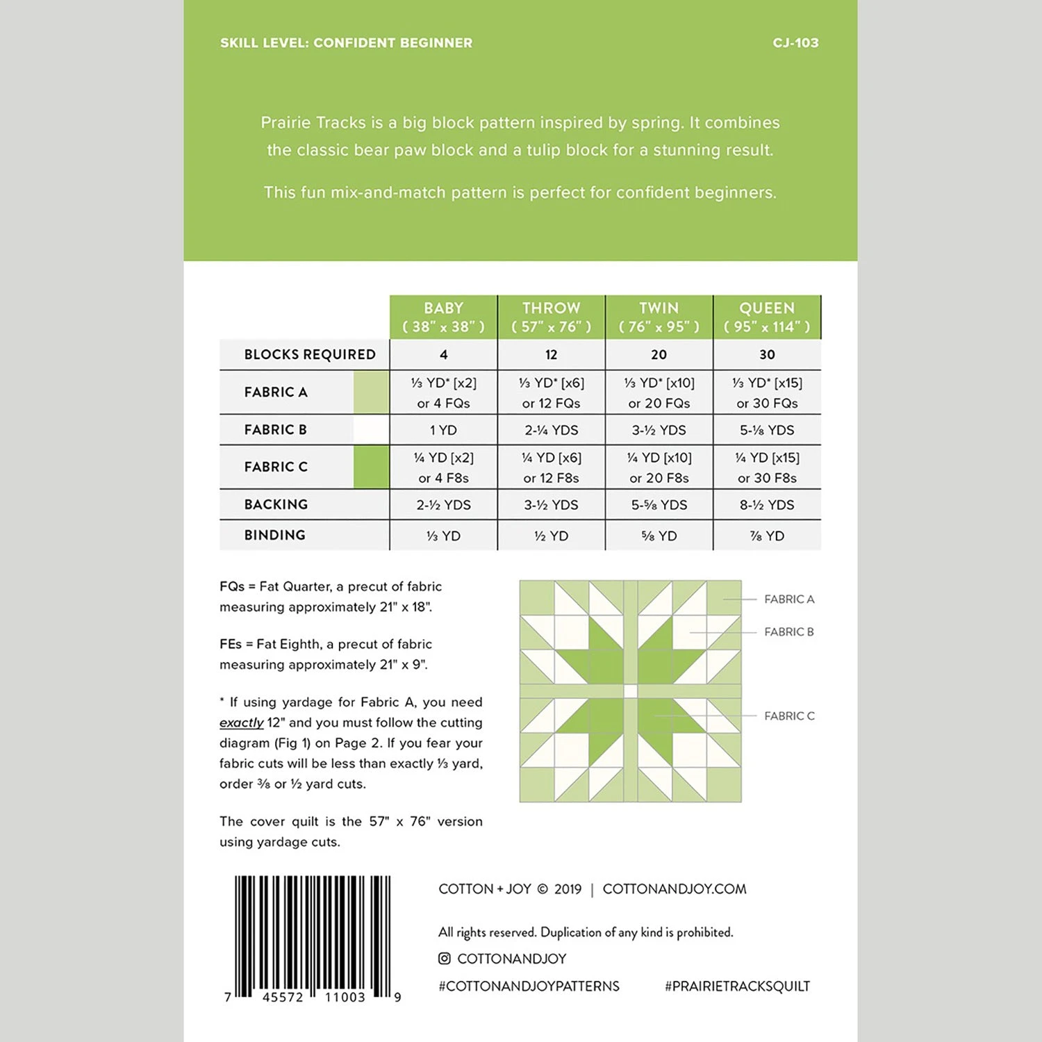 Make tracks to your sewing room and create this quilt! Prairie Tracks from Cotton and Joy is a big block pattern that combines the classic bear paw block and a tulip block. This versatile pattern can be made using fat quarters, yardage cuts, or even scraps from your stash! This fun mix-and-match pattern is perfect for confident beginners. Pattern includes helpful diagrams, detailed instructions, and a Color-Your-Own page to help you decide your fabric choices.