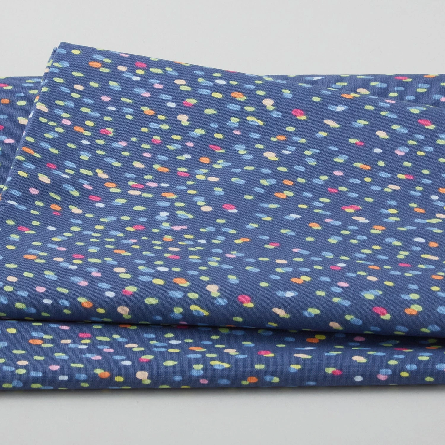 A 2-yard cut of colorful dots on a navy background. Variety is the spice of life, and these 2-yard cotton cuts from Fabric Editions offer plenty of it! Prints such as pink flamingos and scattered hearts add a fun touch to any project, and the solids are great staples for your stash.