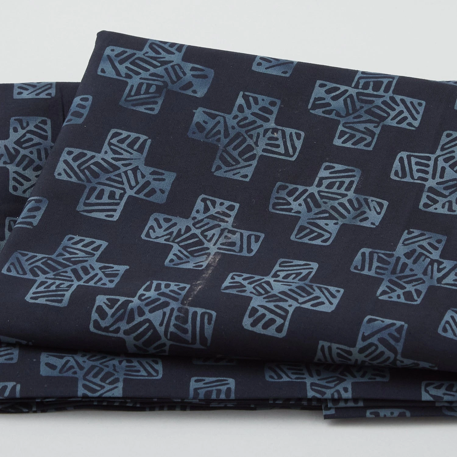 A 2-yard cut of blue patterned crosses arranged on a dark navy batik background. Enjoy the tropic side of life with Pura Vida Batiks by Shayla Wolf from Anthology Fabrics! These batik fabrics are filled to the brim with island motifs and vivid rainforest colors.