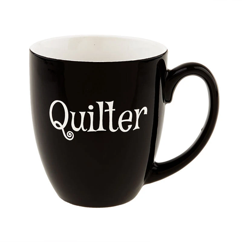 Let everyone know you’re a proud fabric-buying, seam-ripping and always stitching quilter with this fun black, ceramic bistro mug!