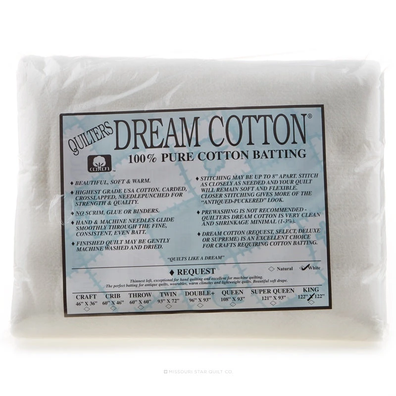 Request is the Thinnest Loft from Quilters Dream- Lightweight, consistent and exceptionally drape-able. Perfect for warm climates, antique restorations, summer quilts, table runners and apparel. Hand quilters love it and even though it was not created for long arm machines, those quilters also love it for its soft drape and for “floating” the quilt top. Made with pride in the USA.