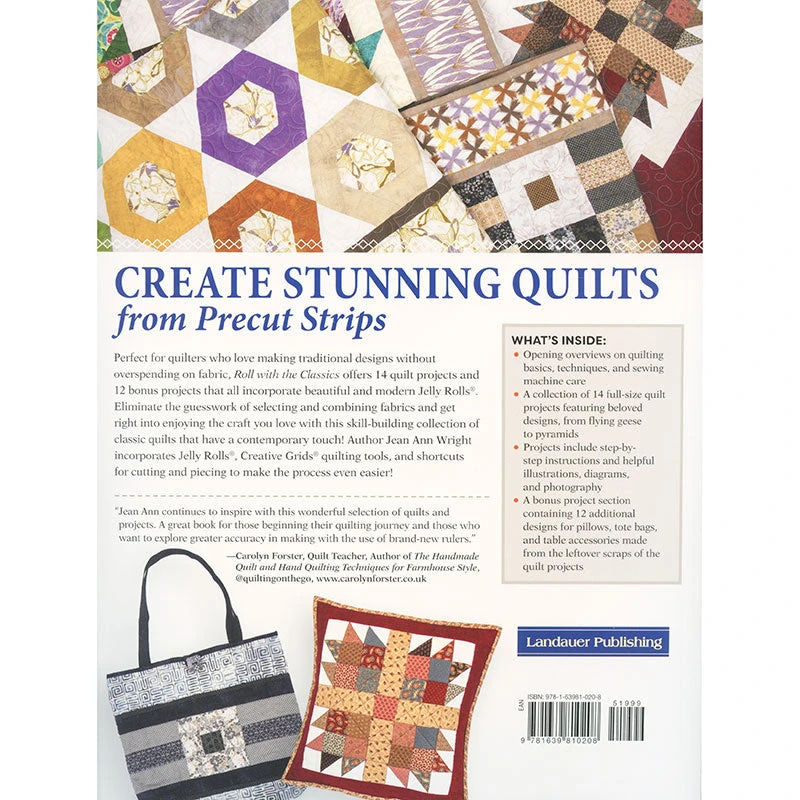Combine timeless quilts with modern jelly roll fabrics! Roll with the Classics by Jean Ann Wright offers 14 beginner-friendly quilting patterns in a traditional style. From flying geese to pyramids, these blocks will make your heart sing!
