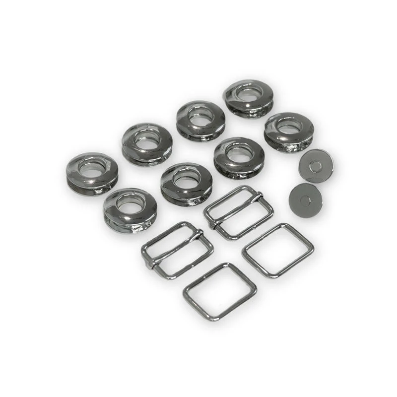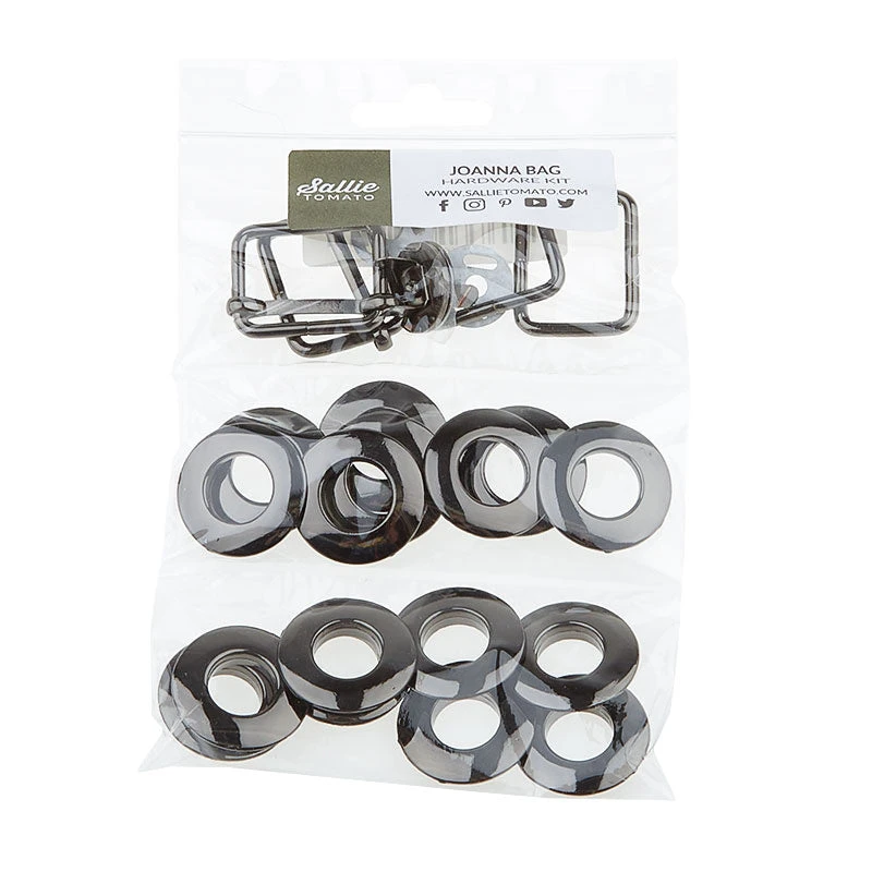 If you like the look of gunmetal for bag projects, grab this hardware kit for your Sallie Tomato Joanna Backpack! This kit includes two 1″ rectangle rings, two 1″ slider buckles, eight 1/2″ grommets, and one 3/4″ magnetic snap — all in a shiny gunmetal finish.